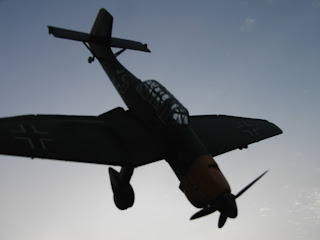 Este modelo lo pinte basandome en un esquema de tres vistas aparecido en la revista Volar, no indicaba la unidad y es muy poco conocida, despues de una larga investigacion, se que es el primer camuflaje usado por los Stukas, con RLM 70 en la parte obscura, y un deconocido Tierra Claro, tal vez de RLM 79, aunque este es muy claro, es mas probable que fuese algun color no reglamentario fabricado en Rumania.